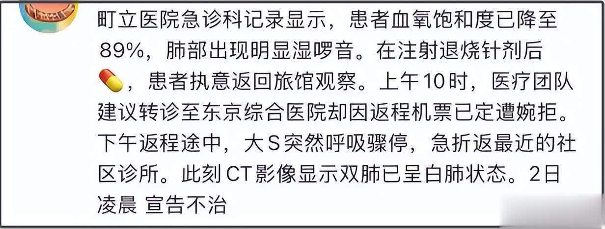 根据日本町立医院急诊科记录显示,家属对大S病情严重程度重视不足,在关键时刻判断失误。病例报告显示血氧低至89%肺部出现湿啰音(肺部病变声响)后,大S仅注射退烧针剂便执意返回旅馆观察,这是第一次错过治疗时机。